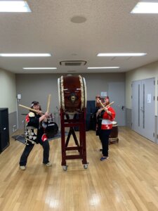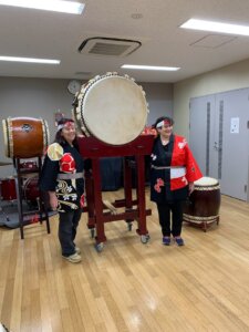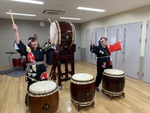 一方の女性が和太鼓が大好きでお友達を巻き込んで体験へ。