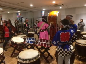 最後は子供達は大太鼓、大人達は桶胴を担いで、開運招福リズムの三三七拍子を打っていきました。