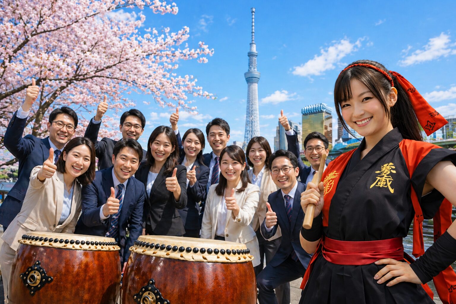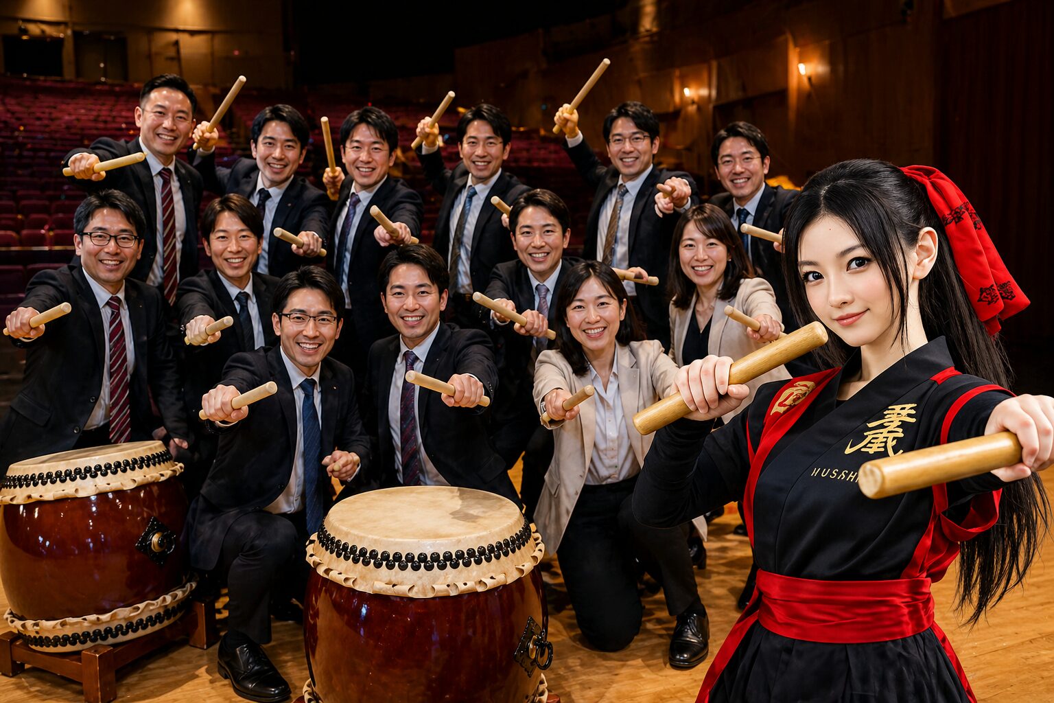 リアルくノ一夢子です。今日は台湾からお越しくださった企業12名様の、和太鼓チームビルディング体験をレポートします。