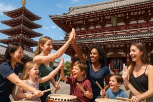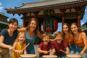 浅草両国エリアで日本の親子、アメリカ在住の後輩親子とフランスから20代のインターン合計6名で和太鼓体験にいらしてくださいました。