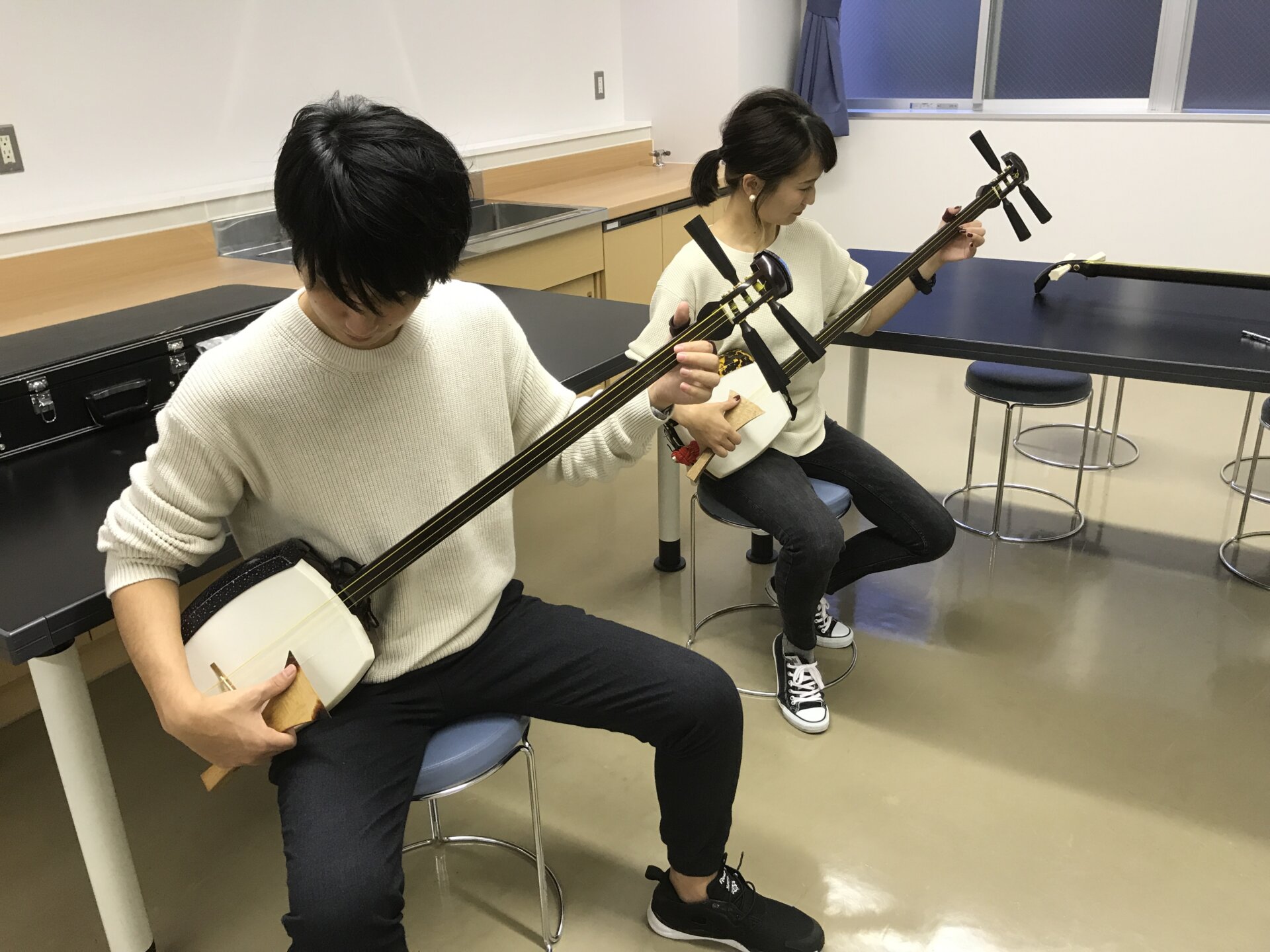 東京にお住まいのカップルがペアで三味線体験。