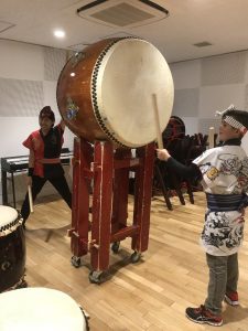 昔、和太鼓は情報伝達の手段として使用されていて、時報など時計の役割もなしていたこと説明しました。話をよく聞いていてくれ、そのまま覚えていてくれて嬉しかったです(o^^o)