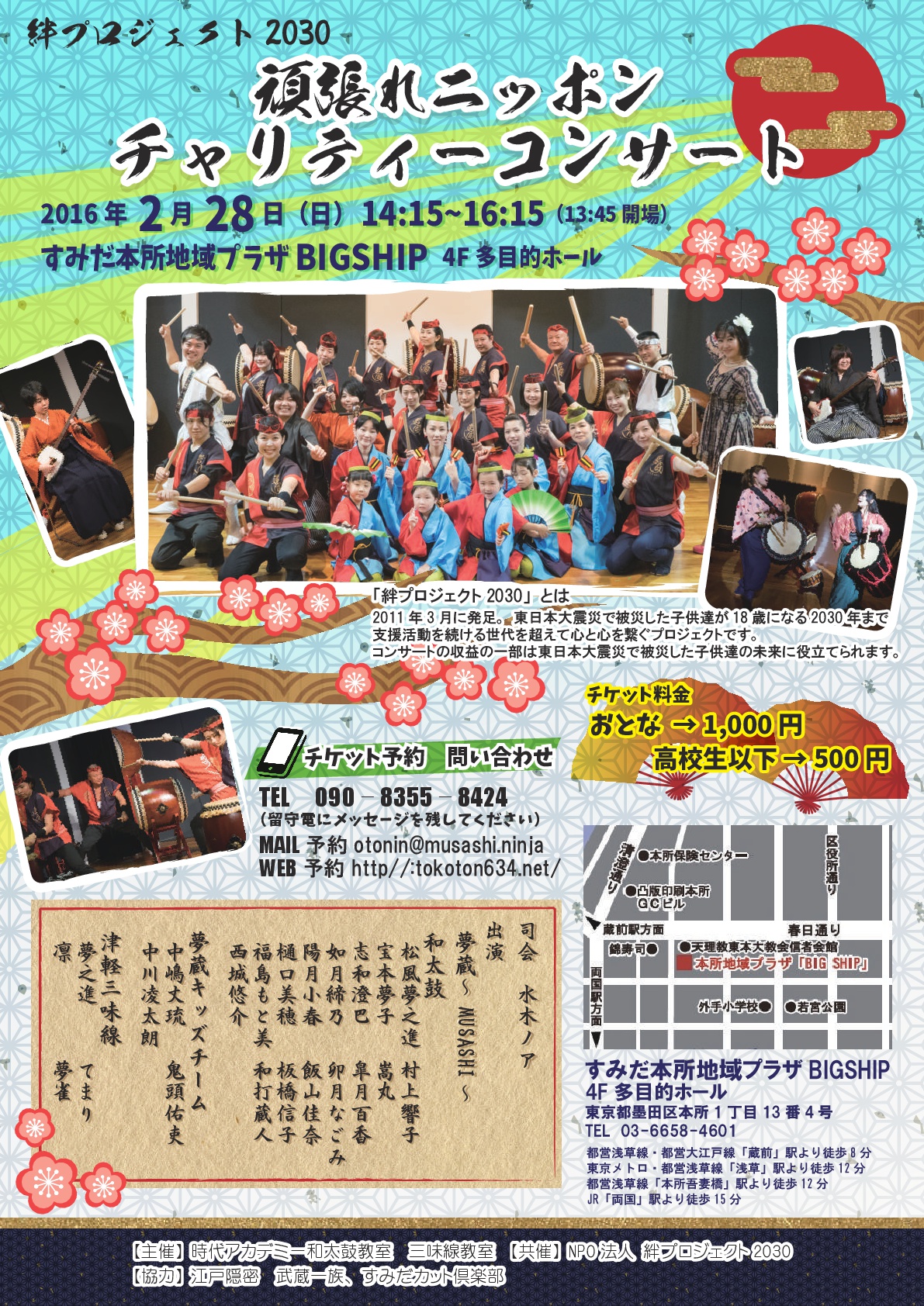 夢蔵MUSASHI第2回和太鼓三味線チャリティーコンサート 東日本大震災で被災した子どもたちが18歳になる2030年まで応援するプロジェクト 絆プロジェクト2030 支援活動をささやかなれど収益の一部で応援。 第二回和太鼓三味線コ...