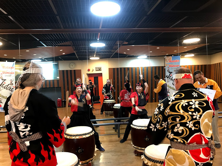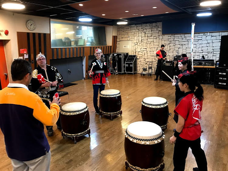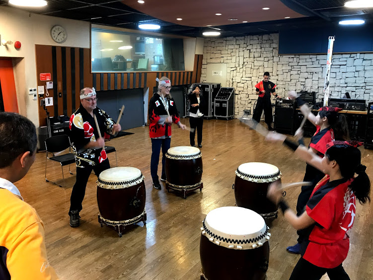 私共の仕草を食い入るように見ながら終始笑顔で太鼓を打ち鳴らす