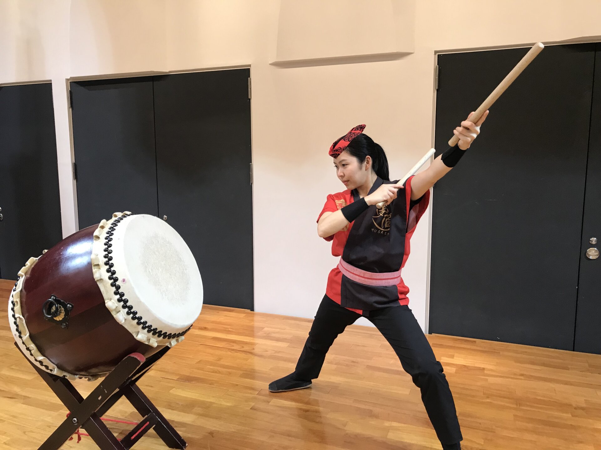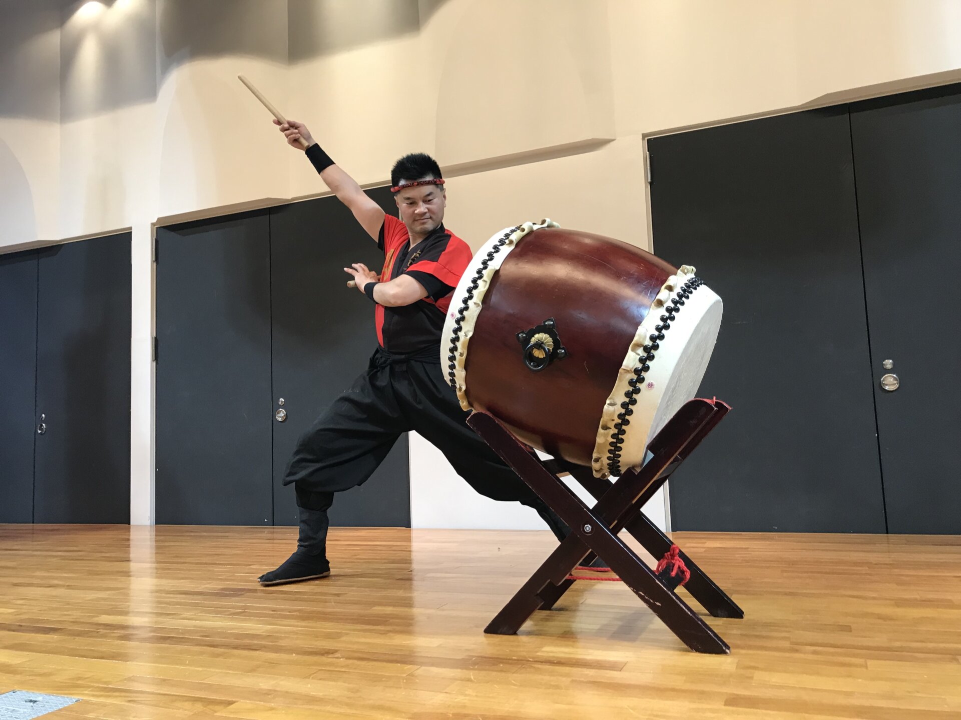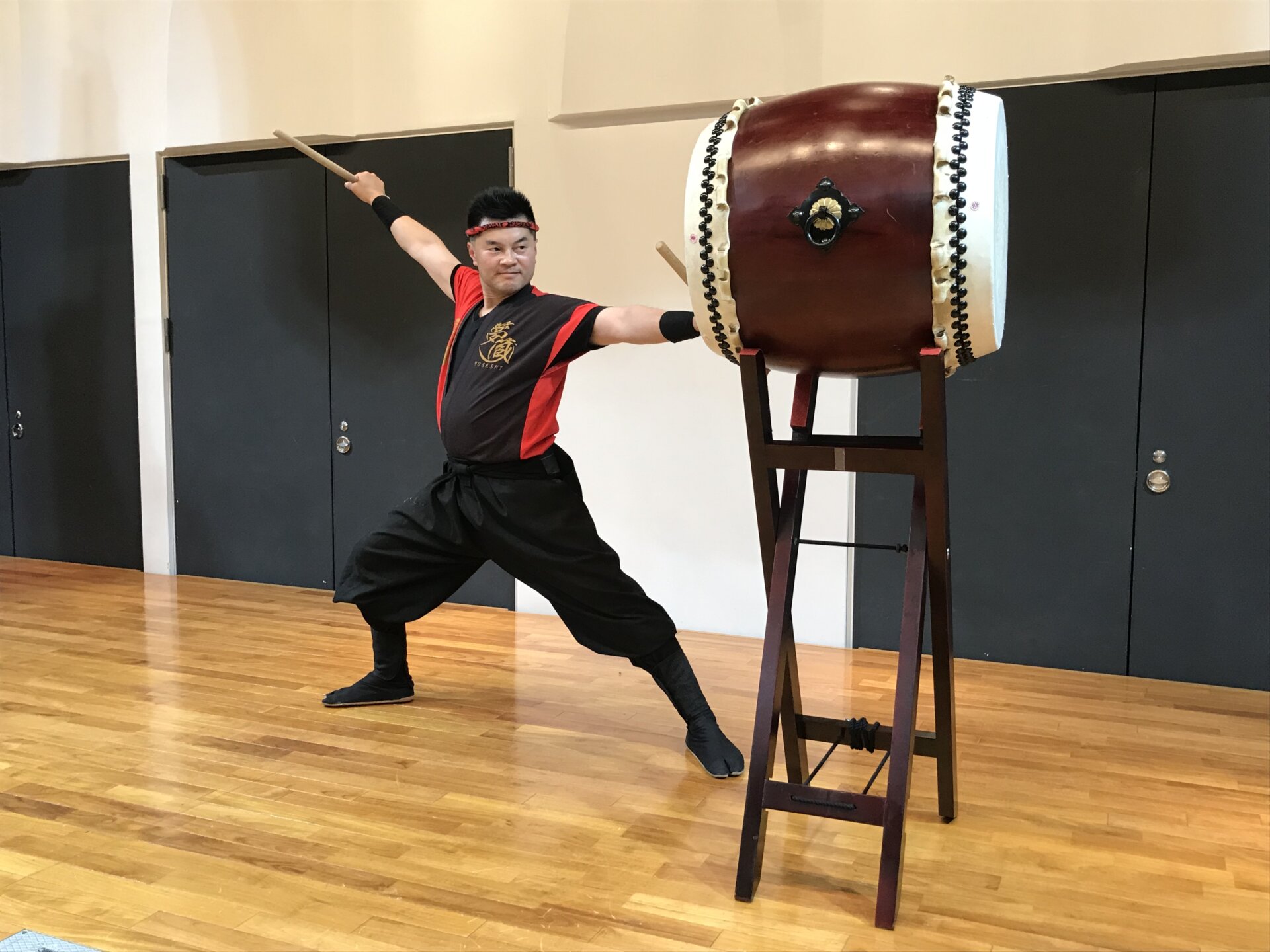 大きめの太鼓で撥なども太目な長い撥を用いてよりダイナミックに