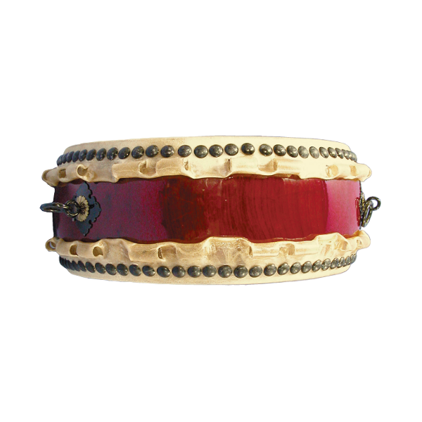 ・かん 胴の中央にある鉄製の部分です。 持ち手 太鼓を持ち上げたり運ぶ際に使用し 飾りがついておりますので化粧面として取り扱うことが一般的です。演奏には使用しません。 |