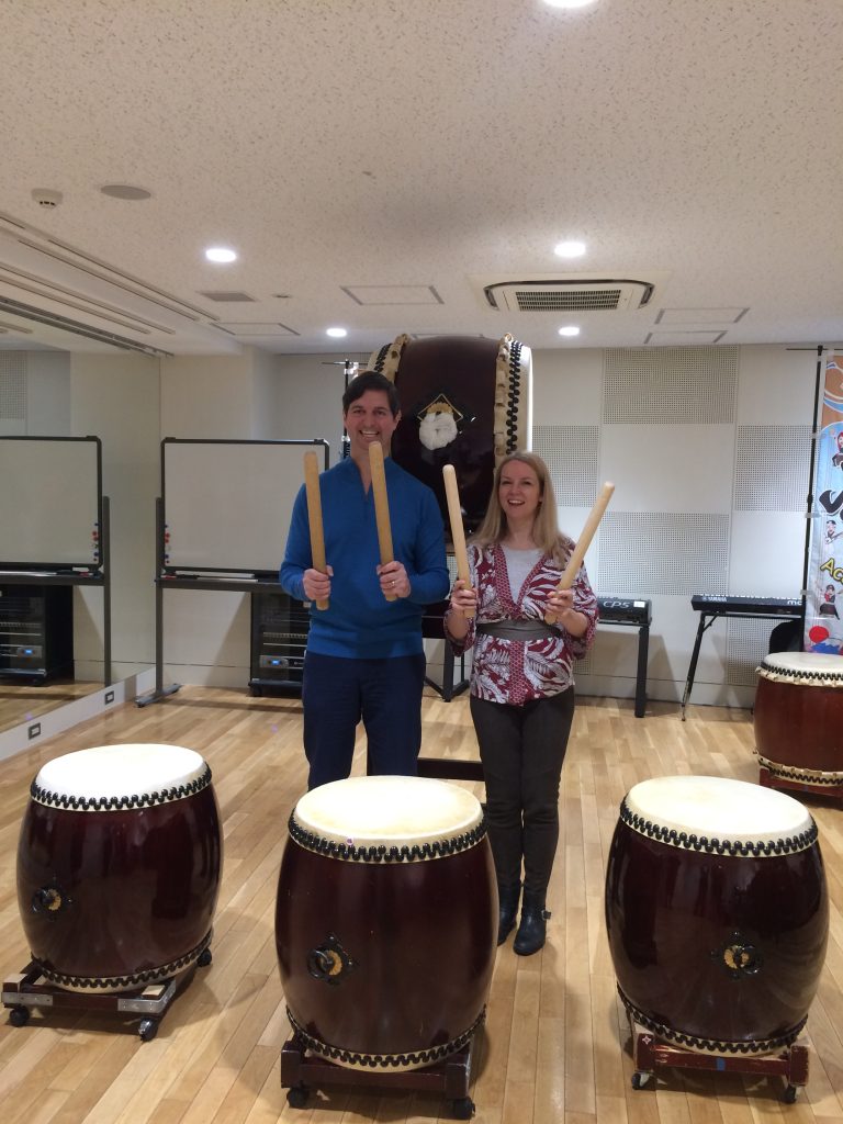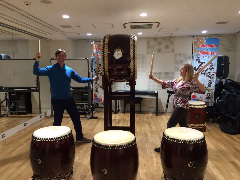 当初、旦那様はビデオ&写真撮影に徹し、奥様だけが体験をされるとのことでしたが途中のかけあいセクションで旦那様に太鼓を打つお手伝いをお願いしたところ、すんなりお仲間に加わってくださりました♪