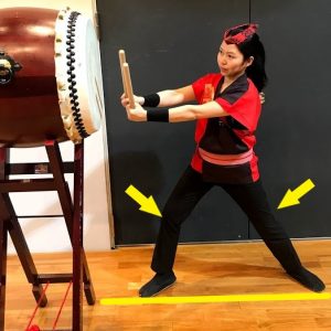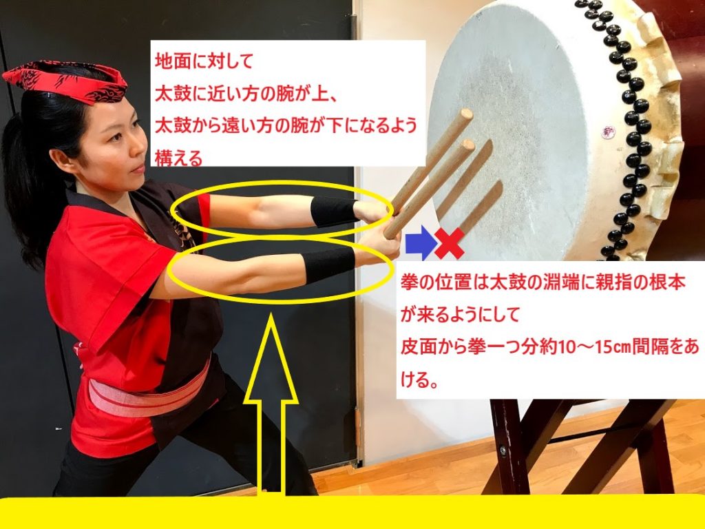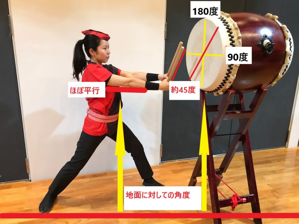 長胴太鼓(宮太鼓)を地面に対して皮面横に置いて 比較的高い位置で打つことを前提として 基本姿勢に基づいた 下半身(腰 腿 つま先) 上半身(腕 拳 撥) 高さ 奥行 幅 角度の 太鼓との位置関係など説明していきたいと思います。 太鼓を両側から一台でペアで打つことが出来 高い位置の横打ちは 目線が高い位置に来るため自然と目立ち 比較的下半身の負荷が少なくとっつきやすいと思います。 立ち方は二通り