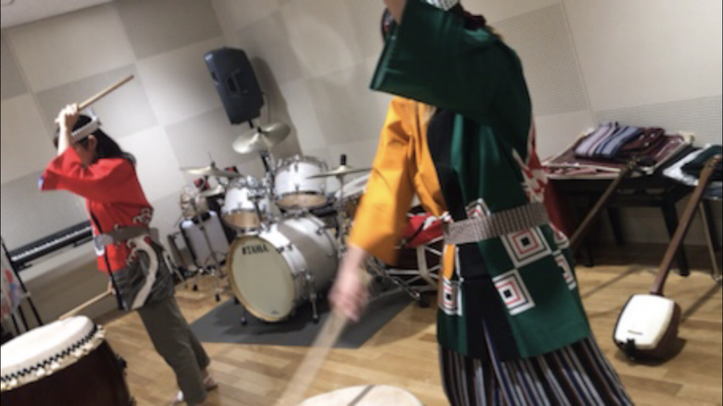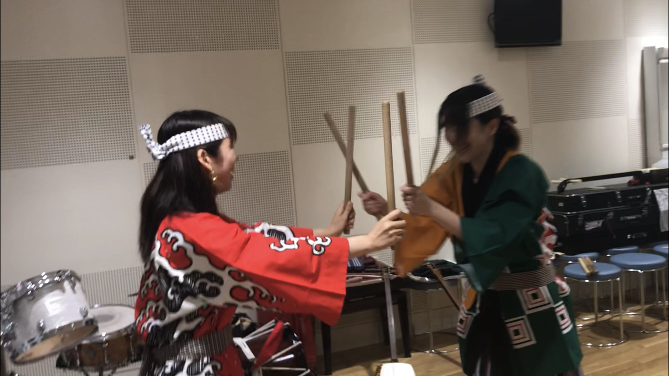 本日は日本国内から2名のご参加です。ニコニコした可愛らしい女性たちです。なんと明日がお誕生日なので、私共の模範演奏は〝祝い太鼓〟をお届けいたしました。法被を着て、いざ和太鼓打ち。一緒に打ったら、いきなりずっしりと力強い音が響くじゃないですか~!お2人の内1人は、和太鼓の経験とのこと‼︎しかも中学の部活で打ってがっつりやられてたみたいです✨