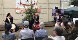 南さんが縄文土器に次々と花を生けていくパフォーマンスに合わせて大太鼓と篠笛を演奏。