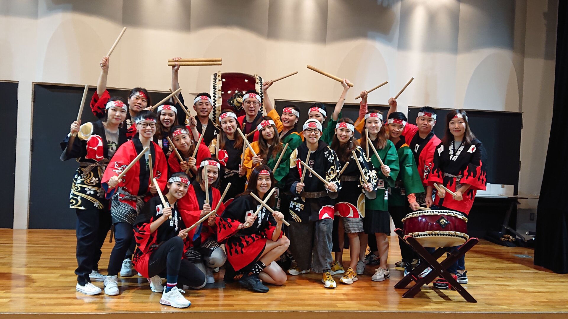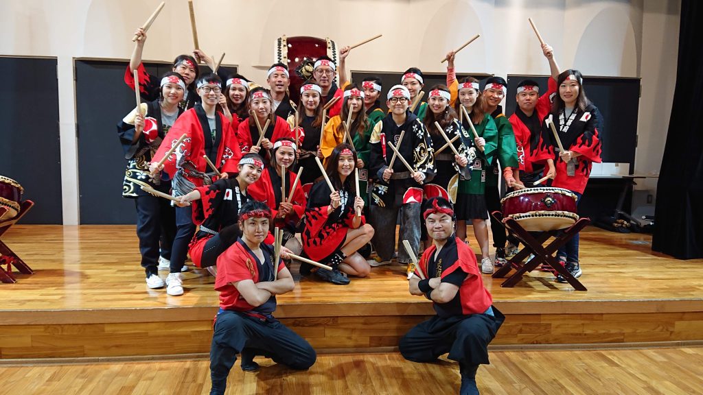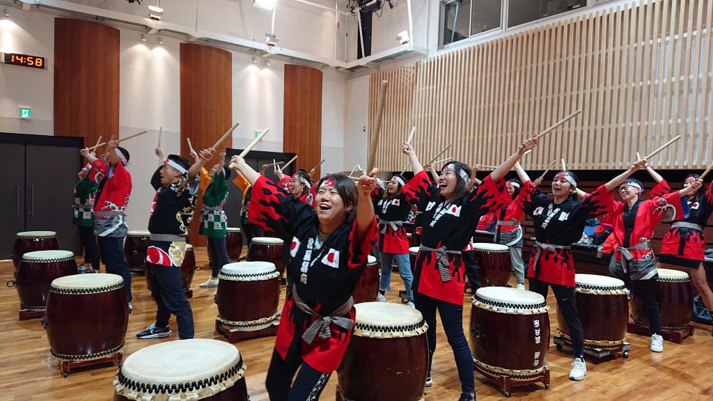 中国から社員旅行20名で法被を纏って和太鼓体験