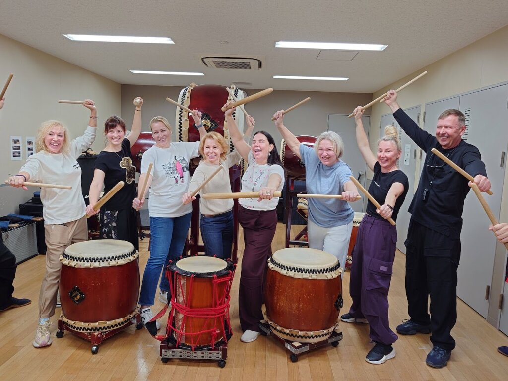 ロシアから観光ツアー9名で女性中心のチームが和太鼓体験