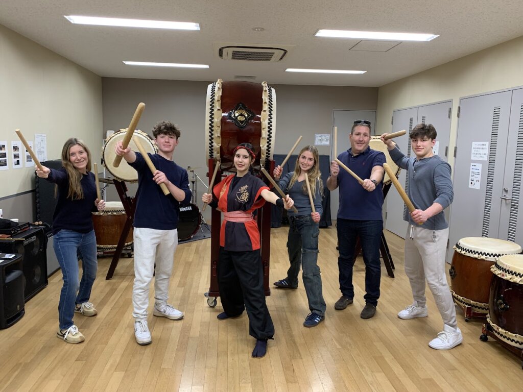 イギリス家族5名とメキシコ友達2名合同で和太鼓体験