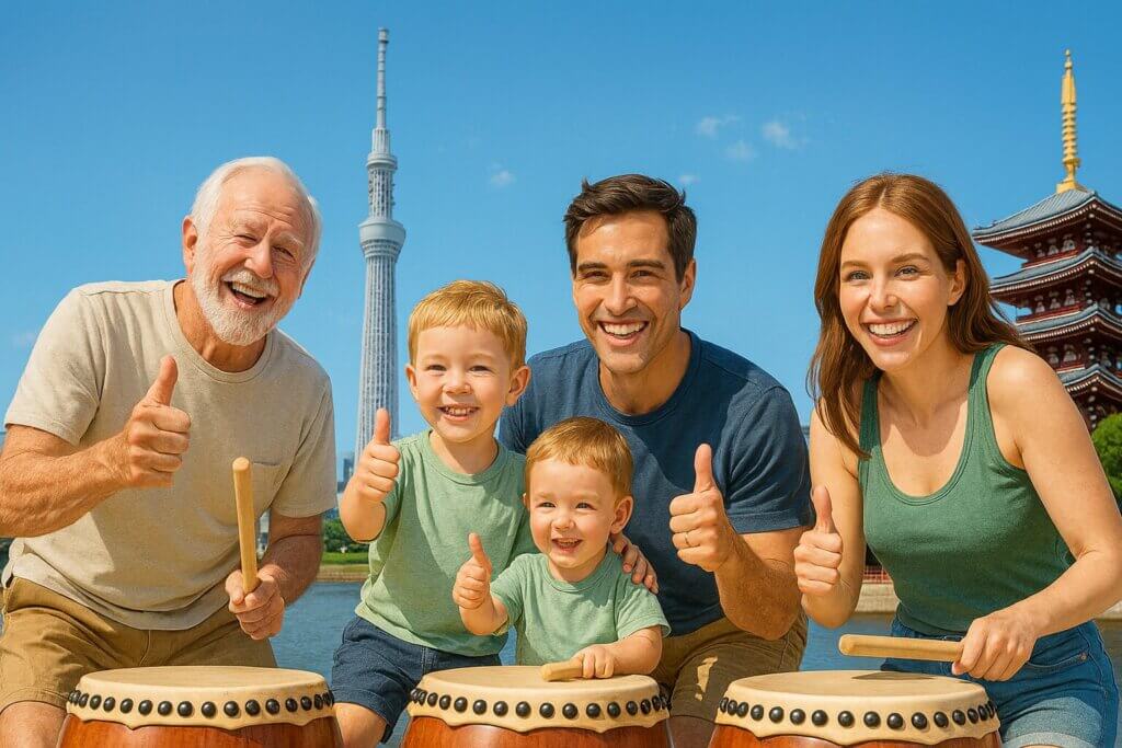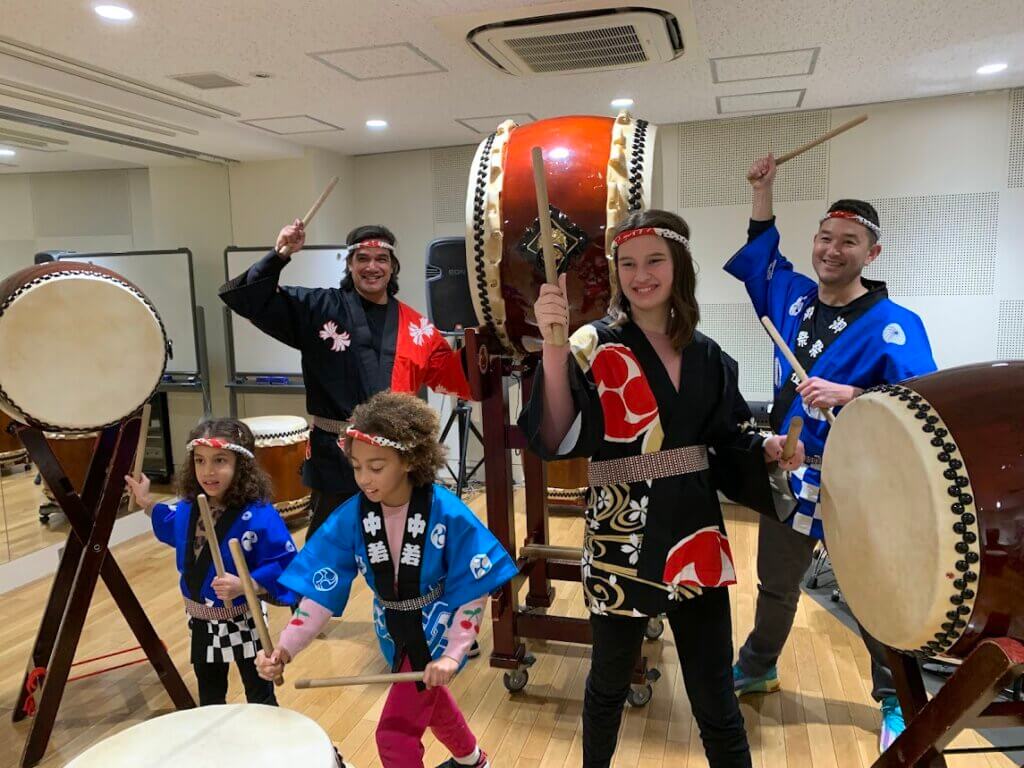 スカイツリーエリアでインドから家族三世代5名で和太鼓体験