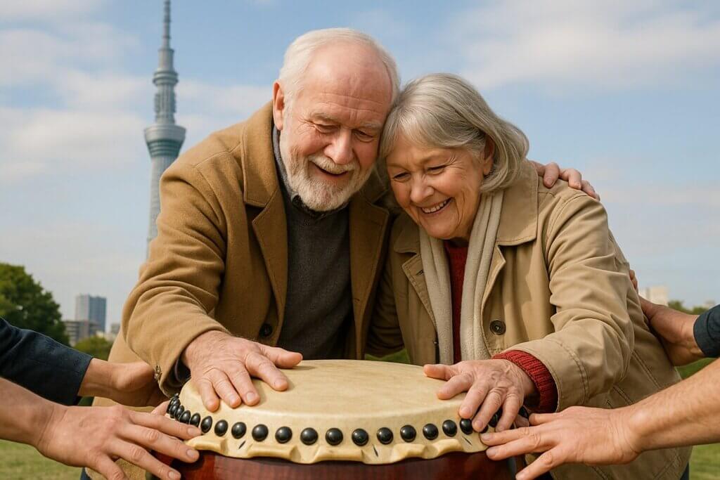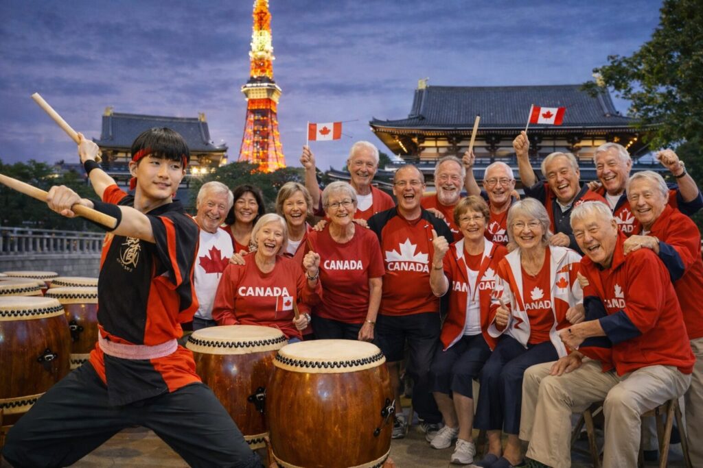 東京タワーでカナダシニア14名が和太鼓体験|安心配慮で生まれた“音の一体感”