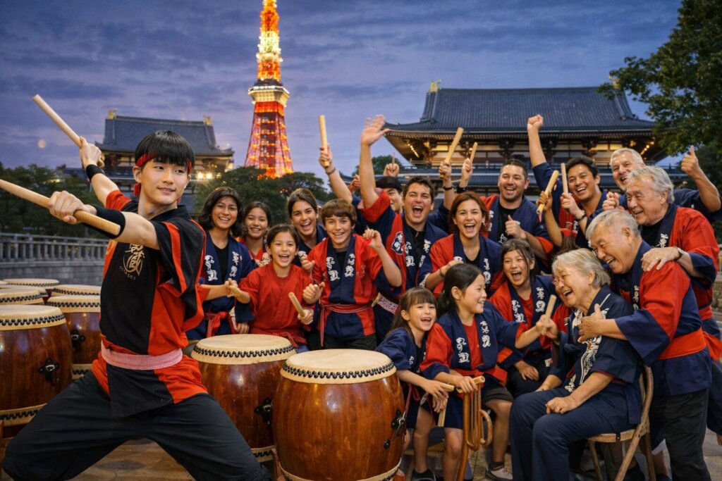 東京タワーエリアでブラジル三世代14名が和太鼓体験|陽気な熱狂のひととき