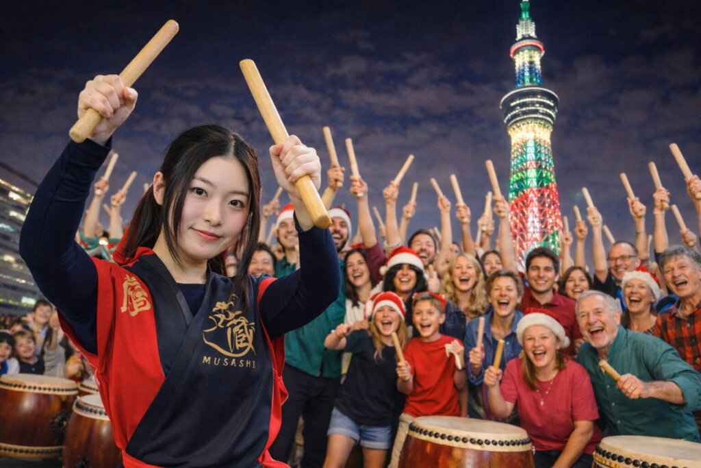 スカイツリーエリアでXmas和太鼓体験ハワイから26名世代を超えて心ひとつに