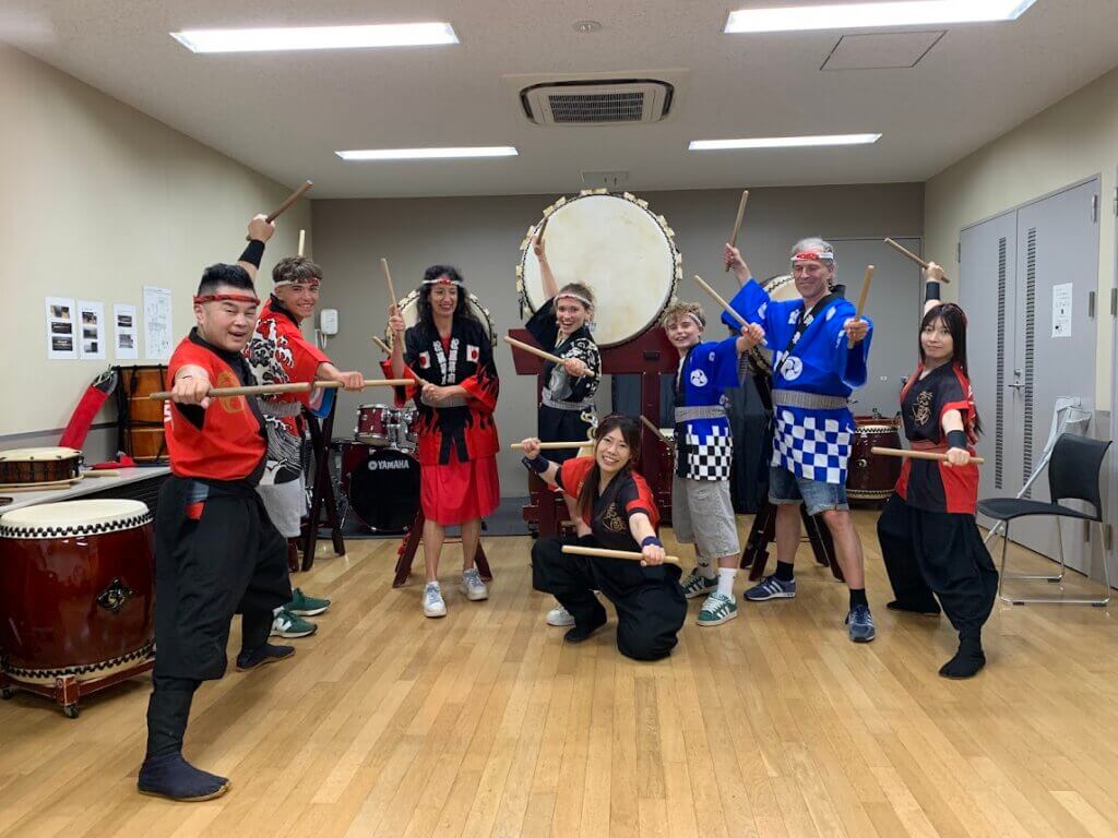スカイツリーエリアで8名で日本語学校和太鼓体験