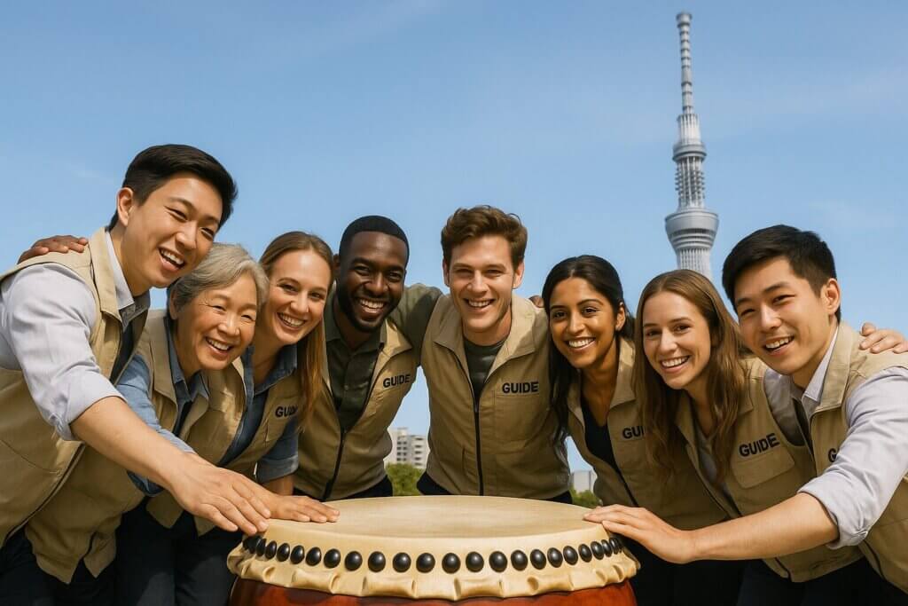 スカイツリーエリアで香港アメリカから9名でインバウンド和太鼓体験