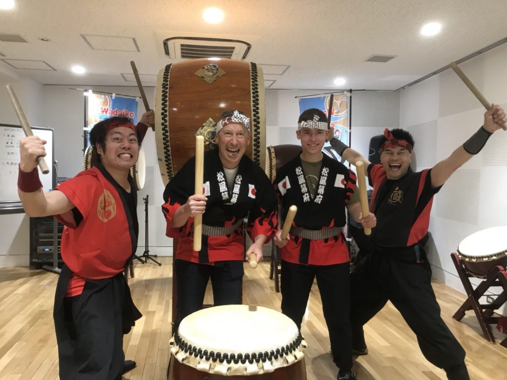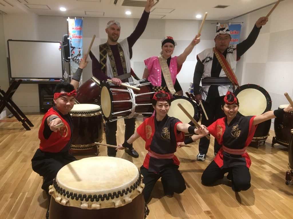 東京観光推進でオーストラリア男性と日本女性3名で貸切和太鼓体験