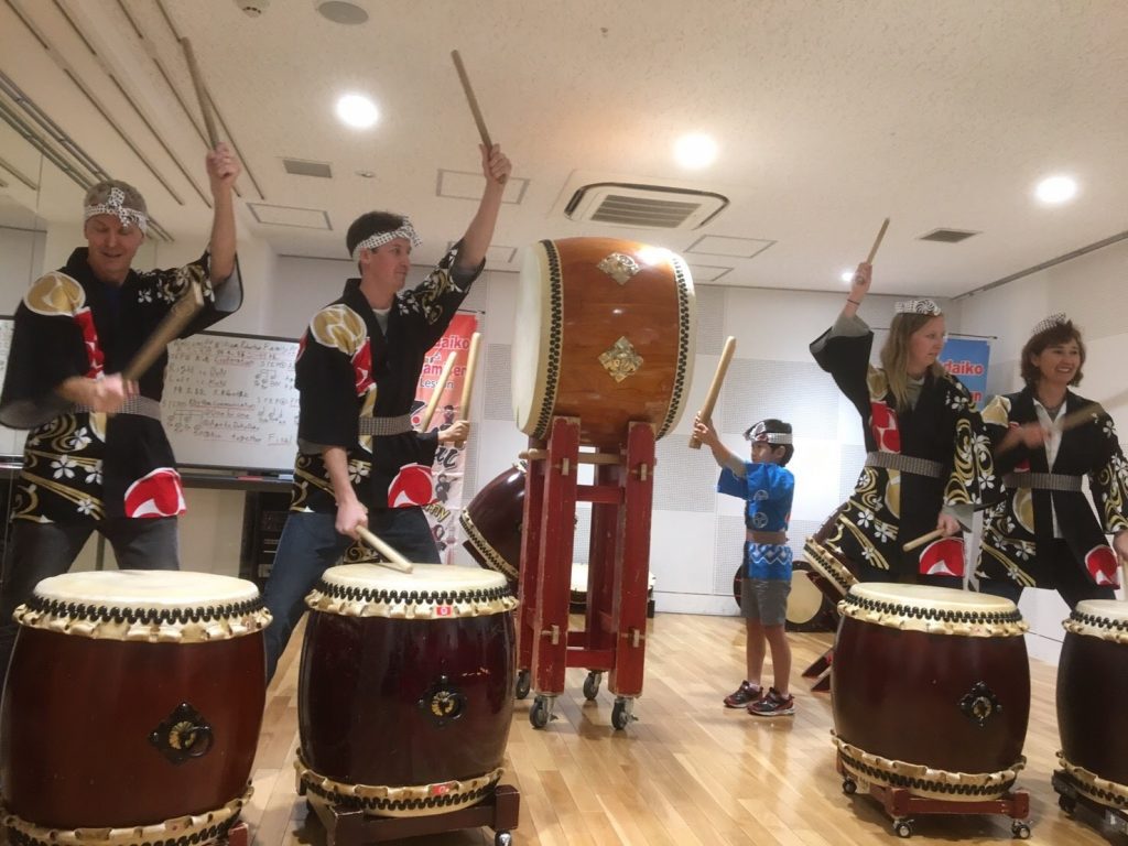 イブにノリノリなアメリカご家族4名と日本人親子が和太鼓体験で大フィーバー!