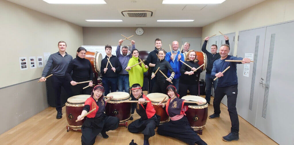 ロシアとウクライナから浜松町で女性14名和太鼓体験60分コース