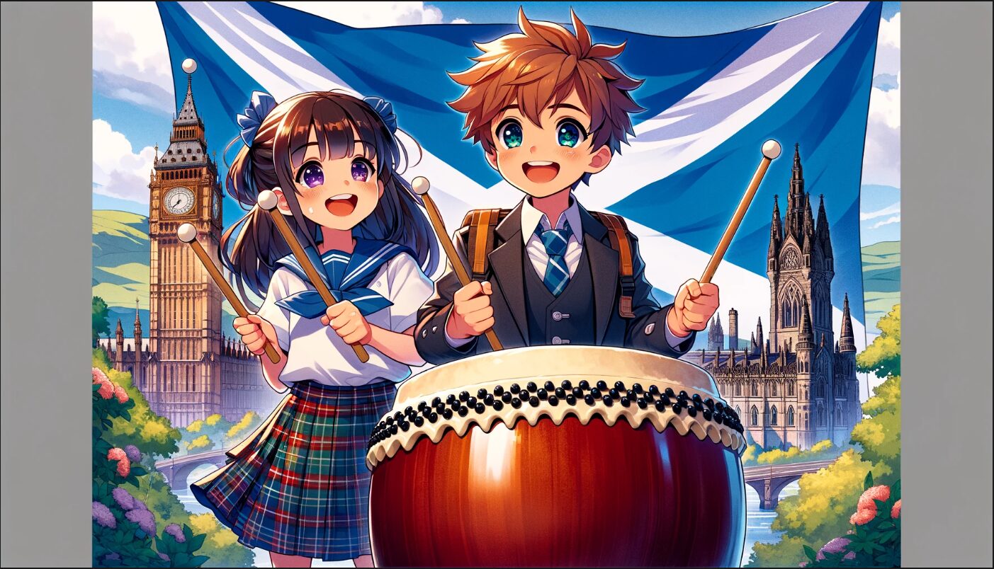 スコットランドドラムとピアノとダンス音楽一家3名 和太鼓体験60分コース