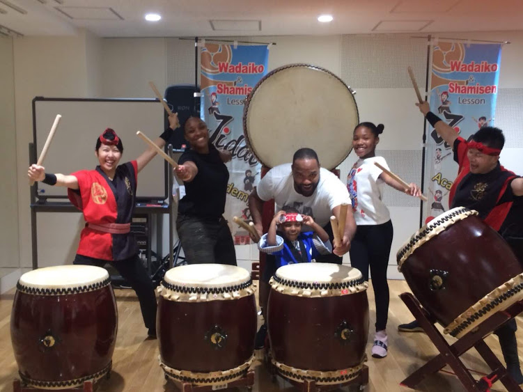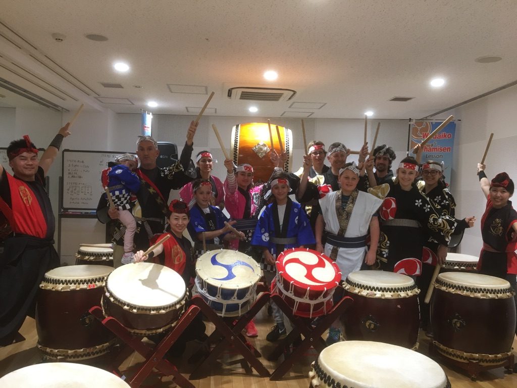 ロンドンから秋葉原で法被を纏って家族3名で和太鼓体験