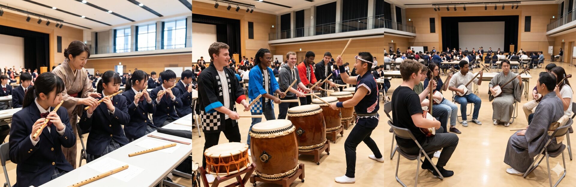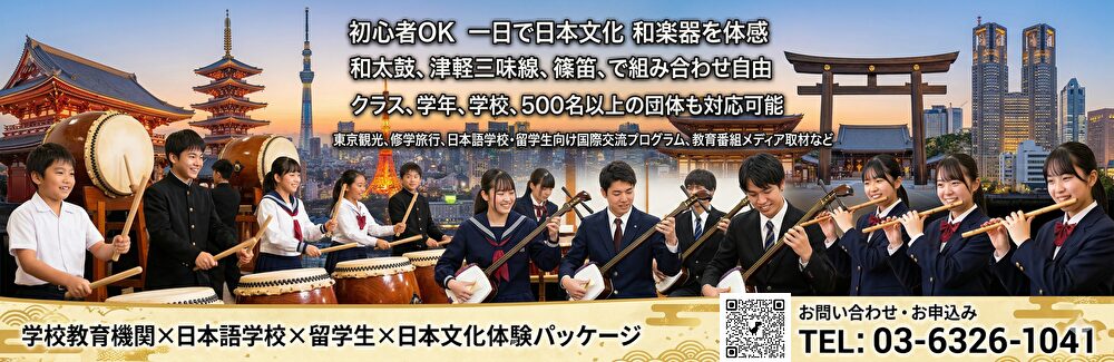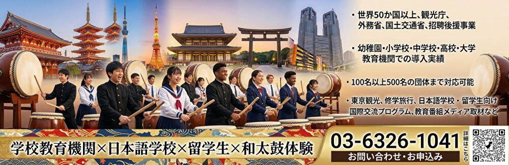 修学旅行、留学生向けプログラム、国際交流イベント、学校行事。そうした場面で、和太鼓や三味線をはじめとする和楽器体験は、「見学だけで終わらない」「全員が参加しやすい」「日本文化を体験型で学べる」プログラムとして活用されています。